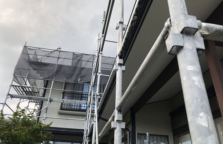 まず、安全確保と飛散防止のための足場と養生ネットを設置します。