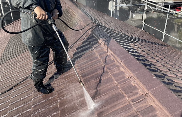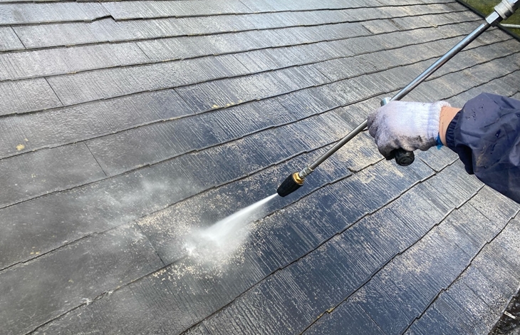 次に、高圧洗浄で屋根材に付着したコケ、カビ、古い塗膜や汚れを徹底的に洗い流します。この下準備が不十分だと、新しい塗料が剥がれやすくなるため、非常に重要な工程です。