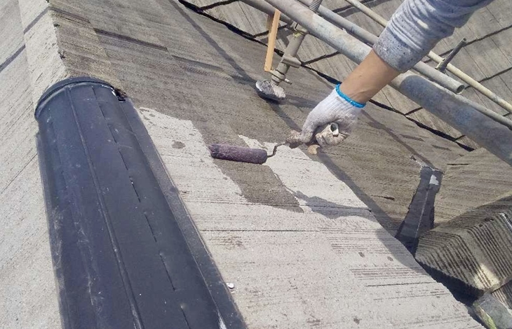その後、屋根材のひび割れや破損の補修(下地補修)を行い、塗料の密着性を高めるための下塗りを施します。